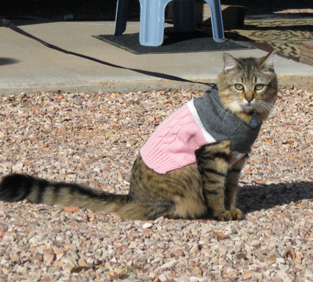 Christmas was wonderful around our rolling condo and our daughter and son-in-law's home. No grandkids, but we did get plenty of kid-shopping for the Angel Tree at Steph and Dan's school. Joan and Steph cooked, we all played games, and doted on the kitties - Izzy and two "grand-cats" that belong to the kids. Cats are easy to buy for - if it's round and can be batted around, it's sure to be a hit. Joan has been threatening to get a sweater for Izzy, since it gets down right chilly here in the desert. I think cats are too proud to be "dressed up", but our daughter wasn't going to be thwarted.
