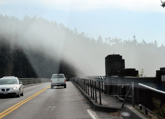 That is fog swirling up and over the bridge (and that bridge is high above the water) - it made for a "tunnel" of good visibility right on the bridge, with the fog rolling overhead. And off to the side...