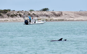 It was mostly cloudy, with the "chance" of precip. A small chance, so we took rain jackets - a guarantee we won't need them. Yesterday was about the flat water and calm conditions; today, I was looking for some dolphins!