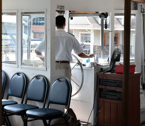 Much like driving a big school bus. Well, mostly without the screaming kids. ;-) Three crew for the trip: the captain, the first mate (who also handled food/drink concessions), and the narrator. The narrator did his best to make it interesting and humorous, but you could tell he has said these same things hundreds (maybe thousands) of times.