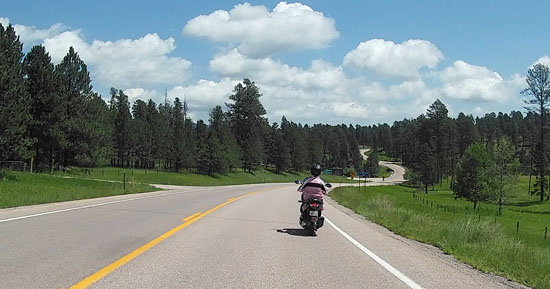 Why the "Van, Mini-van, and Pickup" bit? Thanks for asking. We weren't the only ones on that fun stretch of road today. From the looks on flatlanders' faces going the other way, they weren't having as much fun as we were. Judging by the snail-like forward progress by vehicles (see the title) in front of us (license plates mostly from Iowa, Nebraska, and Minnesota), they were terrified by the roads. As usual, they were working against us... no, I am not paranoid, but each time a mini-van in front of us would pull over to let us pass, a pickup or other large slow vehicle would pull onto the road to take their place. I am sure they have private band radios: "OK, he's on to us - I'll need to pull over as soon as you have another slow mover who can get in front of them to take our place."