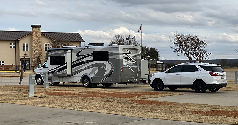 We filled the site with just the motorhome and cargo trailer. Joan parked the Equinox sideways and a bit in the gravel to keep it off the street. You'd think someone building a new RV park would understand "big rig friendly." And we aren't what I would consider a big rig.