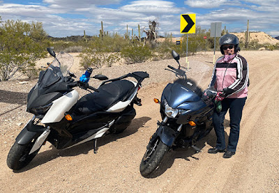 Back in Buckeye, we stopped for a late lunch, then topped off our gas tanks. Joan was disappointed with the 84 mpg she got with the Xmax; I was delighted with the 70 mpg I got with the CTX... considering the size and displacement, that is even better than what Honda says to expect. While I did use Drive mode a couple times on the highway portion, I didn't spare the throttle in Sport mode as I find out what the bike can do. Last time I topped off the Vespa, I got 64 mpg. While it's easy to say it doesn't matter what you get for mileage with these bikes, it cost me $19 to top off the bikes today - the most I've ever paid for fueling our bikes.