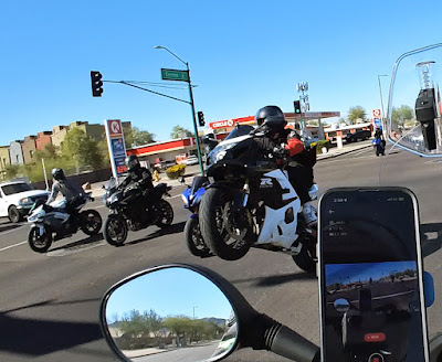 After leaving the mountain, I was stopped at the intersection of Dobbins Road and Central Ave, where I make my turn west to head for home. A sport bike with a young guy and girl pulled into the lane on the far right... across the road were 8 or 9 other sport bike riders heading toward the mountain. There was a LOT of throttle blipping and posturing. No, I cannot participate in that - if you twist the throttle on a scooter, you are going to go. The bikes across the intersection came across the road like the start of a race...